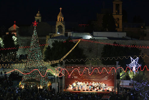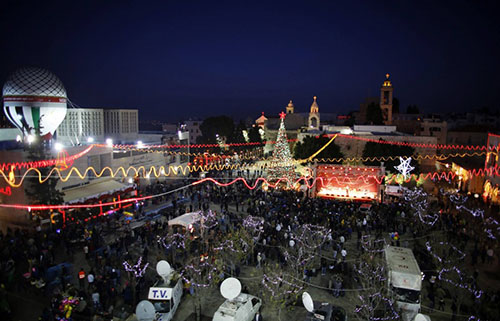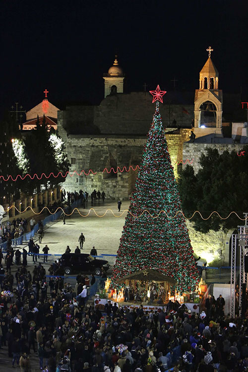 ومع حلول الظلام اضيئت شجرة الميلاد التي يبلغ ارتفاعها 17 مترا مزينة بكرات حمراء في ساحة كنيسة المهد.