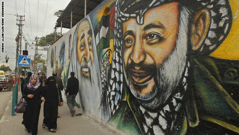مجموعة من الفلسطينيين يمرون بجوار لوحة جدارية تحمل صورة لعرفات ومؤسس حركة حماس أحمد ياسين في غزة