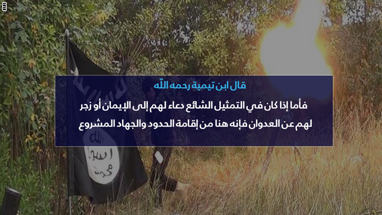 وعرض التنظيم خلال فيديو إحراق الكساسبة لموقف ابن تيمية من خلال رسالة ظهرت على الشاشة جاء فيها: "فأما إذا كان في التمثيل الشائع دعاء لهم إلى الإيمان أو زجر لهم عن العدوان فإنه هنا من إقامة الحدود والجهاد المشروع" الأمر الذي دفع مراقبين مثل الصحفي السعودي المعروف، جمال الخاشقجي، إلى الإشارة لـ"اجتزاء" الفتوى.